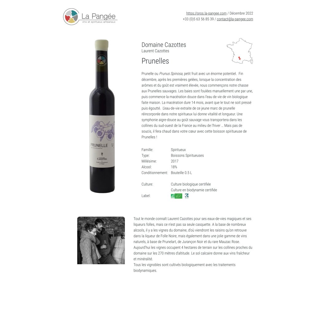 Výsledkem je symfonie sladko-kyselých chutí s divokým charakterem, která vás přenese do zimní krajiny kopců jihozápadní Francie… Ale nebojte se, s touto trnkovou pálenkou bude teplo i ve vašem srdci.